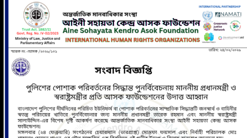পুলিশের ইউনিফর্ম পরিবর্তনের সিদ্ধান্ত পুনর্বিবেচনার দাবি আসক ফাউন্ডেশনের; প্রধানমন্ত্রী ও স্বরাষ্ট্রমন্ত্রীর দৃষ্টি আকর্ষণ